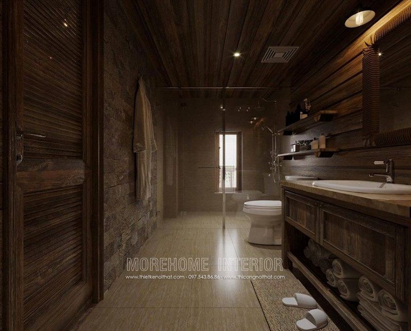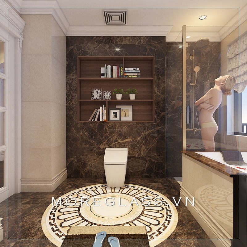 Nội thất phòng tắm cao cấp cho biệt thự sang trọng với kệ trang trí gỗ, vách ngăn kính giúp phân chia hai khu phòng tắm và nhà vệ sinh