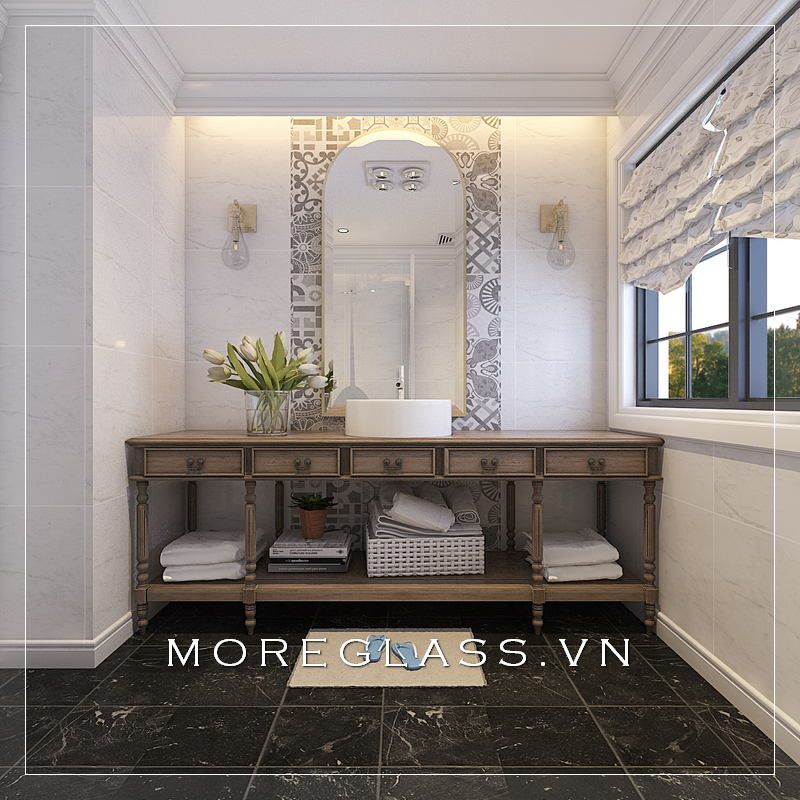 Nội thất phòng tắm biệt thự cao cấp với mẫu kệ tủ để đồ tân cổ điển kết hợp gương phòng tắm độc đáo, sang trọng mang đến không gian thư gian lí tưởng