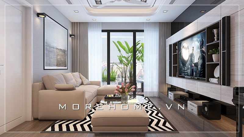 Không gian phòng khách căn hộ chung cư vừa tiện nghi, thoáng đãng lại ấm cúng gần gũi với tâm điểm là bộ sofa văng bọc vải hiện đại sắc kem nhẹ nhàng.
