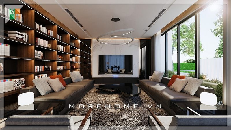 Thiết kế nội thất phòng khách của biệt thự, nhà phố sang trọng, hiện đại với bộ sofa văng da chạy dài ấn tượng.