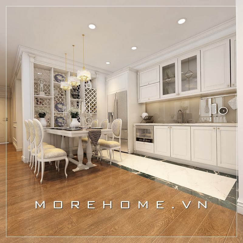 Thiết kế bàn ăn chung cư tân cổ điển, từng chi tiết chạm khắc mềm mại, nhẹ nhàng tạo nên sự sang trọng và tinh tế hơn cho không gian sống của gia chủ