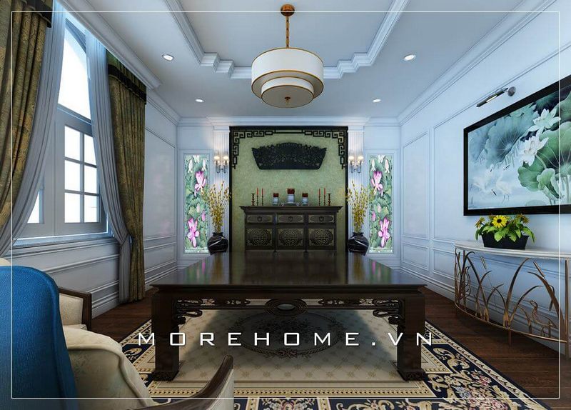 Trang trí phòng thờ đẹp với cách bố trí cửa sổ lớn giúp không gian phòng thờ luôn được thông thoáng mà không phạm phong thủy.