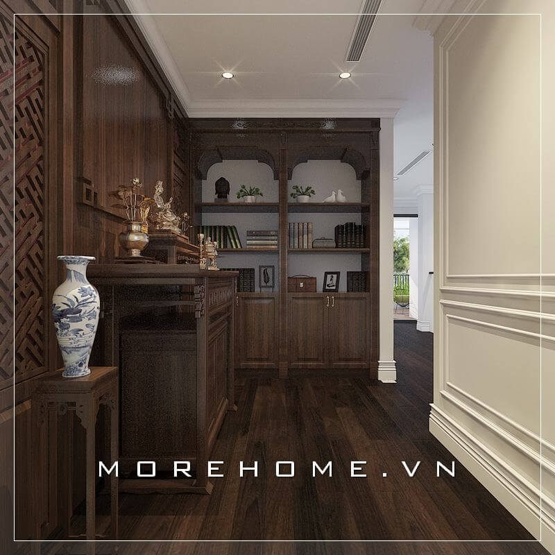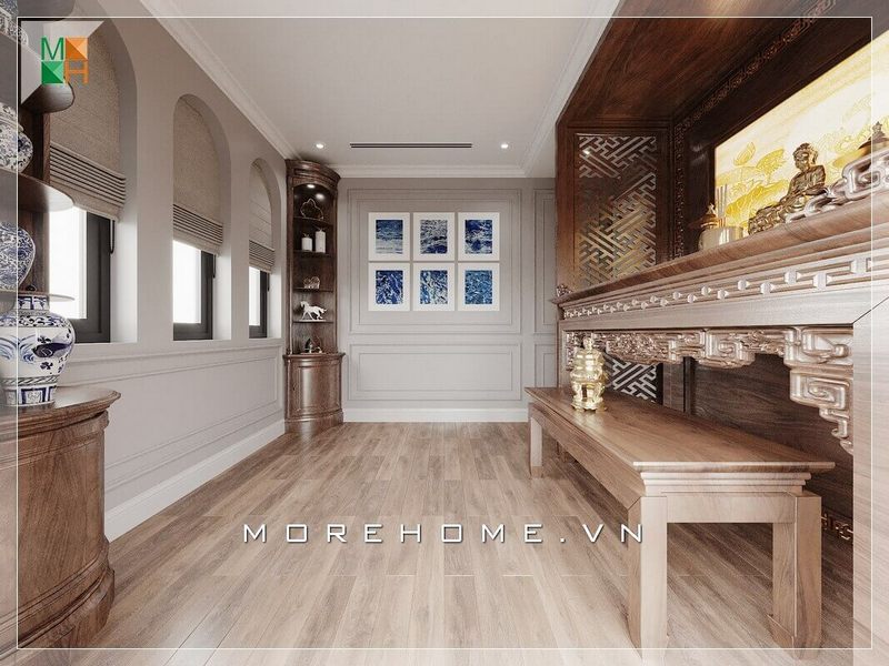 KTS MoreHome đã tận dụng khoảng trống nhỏ trong biệt thự mang đến không gian thờ cúng sang trọng với nội thất phòng thờ gỗ cao cấp
