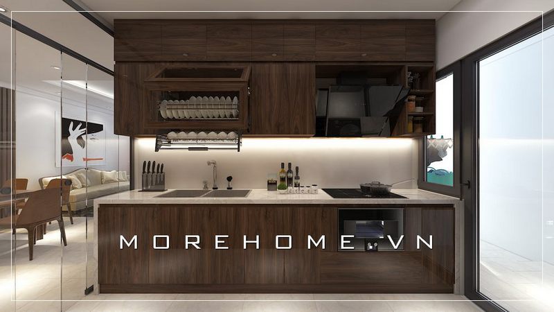 Tủ bếp gỗ việt được kiến trúc sư Morehome thiết kế với những đường chỉ viền cánh đẹp mắt