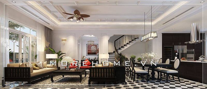 Thiết kế nội thất phòng khách liền phòng ăn theo phong cách gỗ việt tạo nên nét sang trọng và tiện nghi cho các thành viên trong gia đình trong không gian sinh hoạt chung